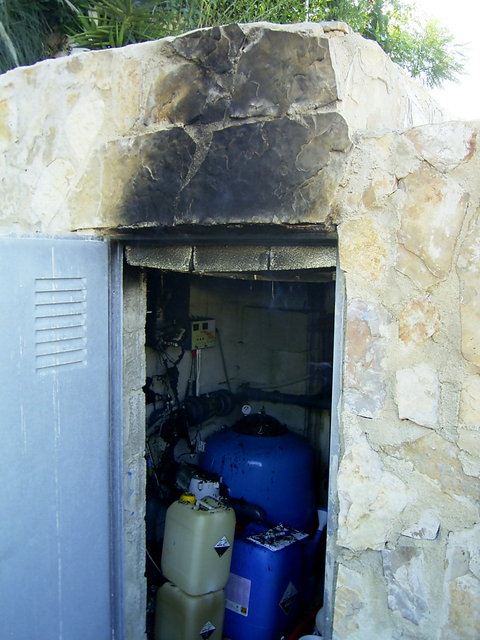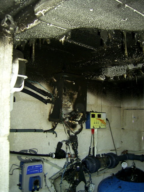 Here in the background you can also see the wall of the pool made of polystyrene blocks and that the ceiling did not catch fire. |